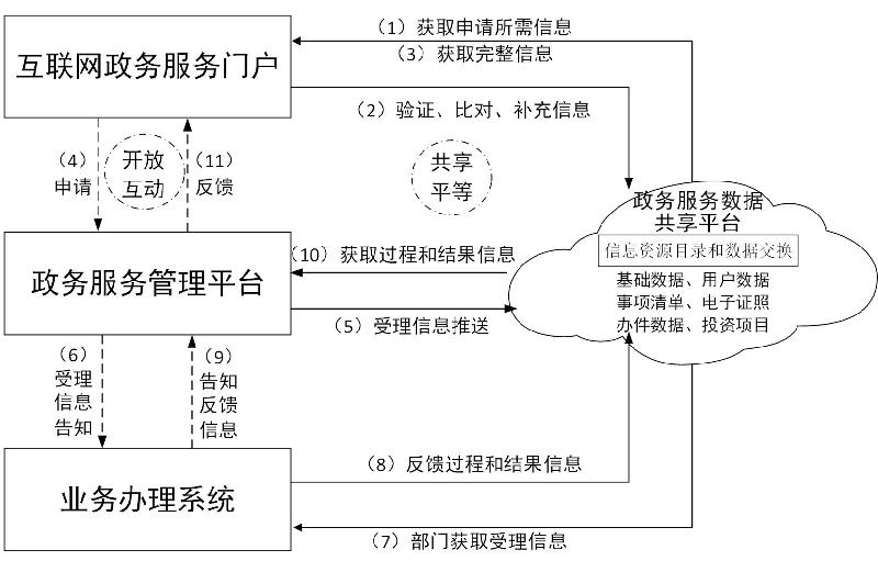 ——互联网政务服务门户:是为自然人和法人提供互联网政务服务的入口,主要通过统一展示、发布政务服务信息,接受自然人和法人的政务服务申请信息,经与政务服务数据共享平台进行数据验证、比对和完善后,发送至政务服务管理平台进行处理,并将相关受理、办理和结果信息反馈申请人。